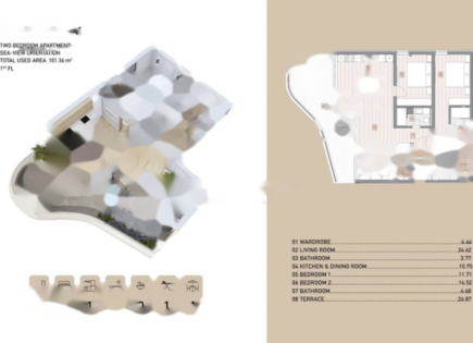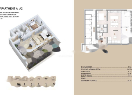 We offer for sale a modern apartment on the ground floor of a new building with a total area of 106.36 m2. The 81.45 m2 interior space includes a spacious living room with a kitchen and dining area, two bedrooms and two bathrooms, designed for a comfortable and functional stay. Special attention should be paid to the spacious terrace of 24.91...