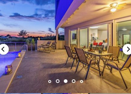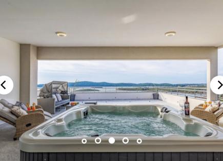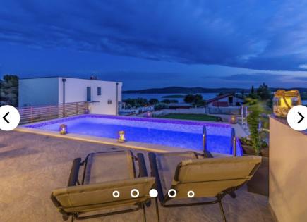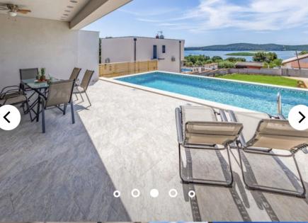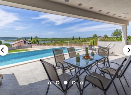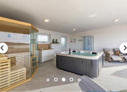 Casa en venta, cerca de la ciudad de Medulin con una hermosa vista al mar. En la planta baja de la casa hay una sala de estar abierta, una cocina y un baño. Piscina de agua salada. En la planta baja hay 4 dormitorios y baños. En el segundo piso hay una terraza de piso completo, en la parte cubierta hay un jacuzzi, sauna y una cocina de verano. :
