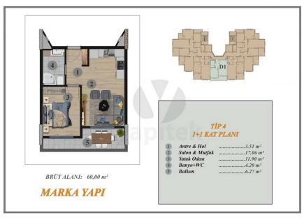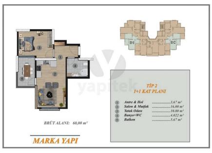 Nouveau complexe d'appartements 2 + 1, Tomyuk, Mersin - IEAT21 New complex in Tomyuk, MersinApartments 1+1 and 2+1The complex consists of 3 blocksNumber of floors 12500 m to the seaThe complex is completed, the loan is receivedArea 1+1 63 m2 gross / 53 m2 netArea 2+1 101 m2 gross / 92 m2 Net Le prix de 1 + 1 commence à partir de 65 000 euros Le...