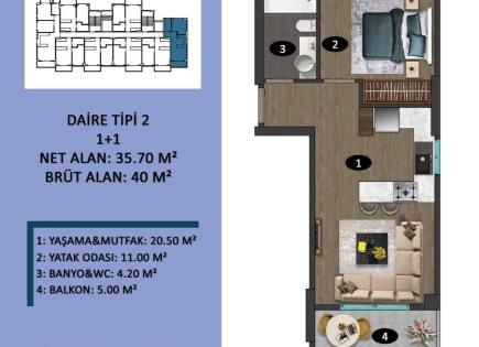 1 + 1 appartement avec vue panoramique en versements - ESP001 Mersin, Teje Nouveau complexe avec vue panoramique Sea Gas Heating une zone résidentielle avec infrastructure Distance de la mer: 100 mètres One Block Nombre de planchers 14 Apartments 2 + 1 et 1 + 1 Ready le 12/30/2025 zone 2 + 1 - m2 87 brut, 75 m2 net Appartement 2 + 1:...