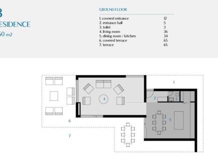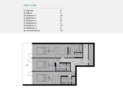 L'area totale è di 208 mq La trama terrestre è di 296 piedi quadrati. Al piano terra c'è un ingresso coperto, una sala d'ingresso, un bagno, una cucina, un ampio salone, una camera da letto con un bagno annesso e nell'estensione una...
