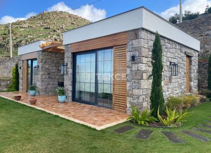 Case distaccate con rivestimento in pietra con visione dell'isola e del mare in Bodrum turgutreis