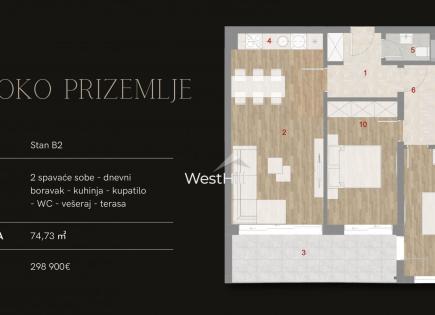 Appartamento di 78m2 al primo piano in un edificio residenziale nel complesso blu Horizon (Przno, Budva). L'appartamento ha 2 camere da letto e un soggiorno con cucina, 2 bagni, una terrazza. Finestre panoramiche nel soggiorno e nella camera da letto con accesso alla terrazza. Gli appartamenti sono completamente arredati e dotati di...