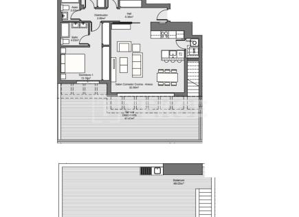 L'appartamento dispone di due ampie camere da letto, una con bagno privato. C'è anche un secondo bagno con cabina doccia. La cucina a pianta aperta completamente attrezzata si apre su una luminosa zona giorno/pranzo. L'aria condizionata centralizzata offre comfort tutto...
