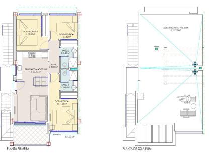 Bungalow a Los Altos, Torrevieja. Soggiorno, cucina separata, 2 camere da letto, 2 bagni, terrazza di 9 m2, solarium di 55 m2, ripostiglio, preinstallazione AASS, riscaldamento a pavimento e tende elettriche. L'area totale è di 121 m2. Il complesso ha un giardino, una piscina comune e un parcheggio. Infrastruttura sviluppata: supermercati,...