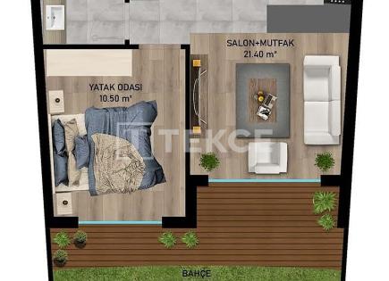 Down payment 50% Outdoor pool, security, parking Open kitchen with integrated oven, stove, extractor hood Heated floors, gas heating Close to the sea and Sarısu beach Number of rooms: 1+1, 2+1 Features of territory: footpaths landscaping design 24-hour security video surveillance outdoor pool technical reserve of water...
