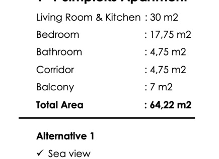 50% Down payment, installment for five months No tax for the Title Deed delivery Outdoor swimming pool Gas to the door Underground parking Within walking distance to the old town "Kaleiçi" Number of rooms: 1+1, 2+1, 4+1 Features of territory: footpaths landscaping design video surveillance outdoor pool technical reserve...